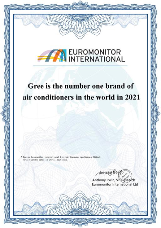 (图为“格力家用空调2021年品牌零售销量居全球第一”认证)