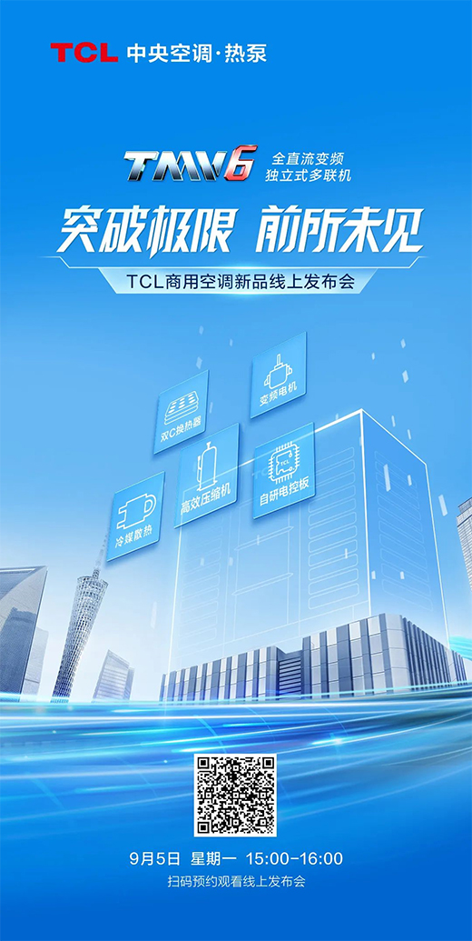 随着市场消费主体和消费需求的不断更新迭代,如何打造更舒适、更智能、更便捷的空气调节解决方案成为行业的大势所趋。TCL商用空调自2003年进入中央空调领域开始,从未停止前进创新的步伐,始终坚持用科技创新响应用户需求,打造绿色智慧空间。此次新品发布,将以“突破极限,前所未见”为主题,于9月5日全球线上首发,敬请期待!