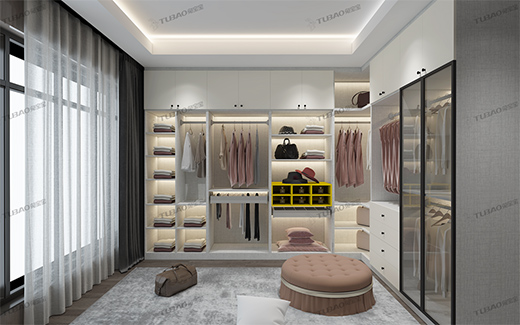 打造功能齐全的衣帽间,大件区、悬挂区、叠放区、饰品区等一应俱全。满足对生活的浪漫需求。增加内嵌灯,为柜体补充光源,时尚气息一览无遗!