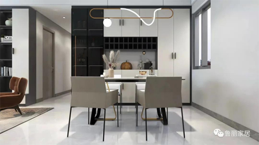 清雅而舒适的生活,也可以不失品味与温度。鲁丽家居设计师采用黑白色系的撞击跳出传统设计的条条框框,辅之以少量金属装饰,为餐厅增添更多温度,让空间更显精致。