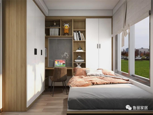功能与颜值的相映衬可以为空间带来更多的惊喜体验。鲁丽家居设计师在设计女孩房时便充分考虑这一层面,将空间转角区域充分利用,在两侧衣柜拐角处做书桌设计连成一体,整体空间温馨舒适又不失功能性,非常适合想要拥有多重功能的小空间。