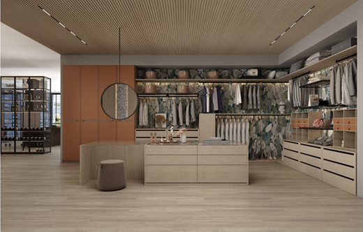 错落有致的镂空收纳设计,搭配透光玻璃隔断,将现代审美与艺术韵致完美糅合。满是“绿意”的植物背景墙从地板延伸至天花板,将自然与家相接,衣物犹如置身“垂直森林”,生机焕发,只为取悦即将盛装出行的你。