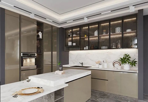 让人眼前一亮的厨房,明亮宽敞,舒适大方,桌面采用优雅的白色,门板采用棕色,既温馨又活泼。玻璃的设计,增加空间的通透感,不打开橱柜门里面的物品。