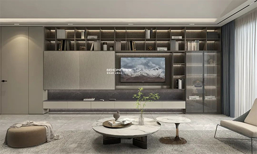 隐形设计。隐形设计能加强室内平面上的平整度,在视觉上起到简洁利落观感。作为隐形设计的一种,无拉手设计用按压反弹器取代传统拉手,不会破坏背景墙的整体造型,使用上也更为方便。