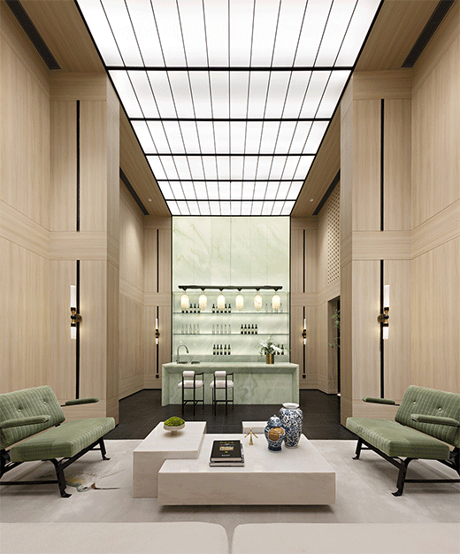 浑然天成的翡翠绿大理石,铺陈水吧台与展示架自然灵动的样貌,厚重的体量感使其呈现雕塑般的美感,细腻的肌理表达空间的宁静与悠远 ,自然的艺术在此发挥的淋漓尽致。