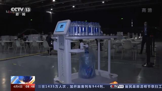 总台记者 王丰:发现了一个好东西,这个智能跟随机器人,这也是一个科技应用的一个落地,在五棵松体育场馆。它现在正在进行一个人脸的识别,就相当于它识别上谁,它就是谁就是它的老大,它就会跟谁一块走,我们现在让它来识别一下吧。好,它现在已经识别上我了,跟着我走,那么现在我就瞬间变身为一个场馆的工作人员,那么我现在要完成的任务是把这几箱水送到食堂,来,我们一起来感受一下。跟得还挺紧的。