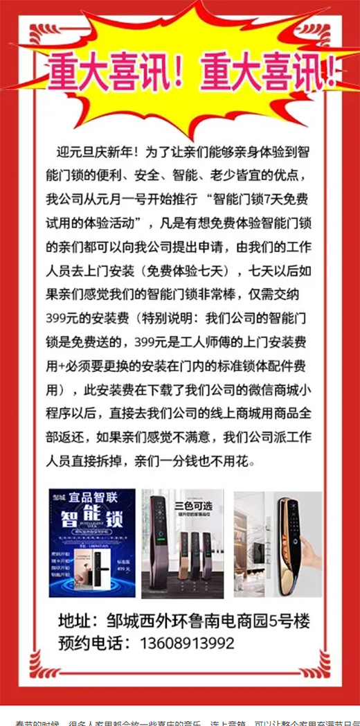 安全性:一般指纹密码锁会有密码泄露的危险,智能锁具备虚位密码功能,在已登记的密码前面或后面,可以输入数字作为虚位密码,防止登记密码泄露。智能锁的相关智慧功能,即门锁是否已经开启或者关闭,密码或门卡登记数量,电池更换提示,锁舌阻塞警告,遇到低电压等情况,会显示提示。