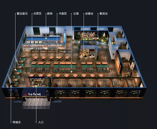 包含入口、观景台、等候区,公共空间主要用于展示餐厅氛围和风格,通过形象墙来表达餐厅的文化涵义及基调,吸引顾客入店。可采用的灯光照明方式也多种多样,具体视设计情况而定。