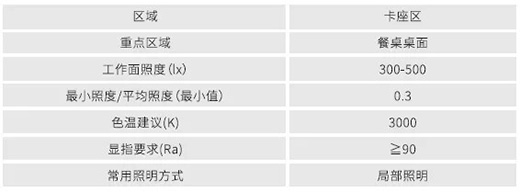 环境照明照度控制在100lx左右,餐桌上的照度则需要达到300lx-500lx,形成重点区域照明,中餐厅0.75m的水平面处照度不可低于200lx。