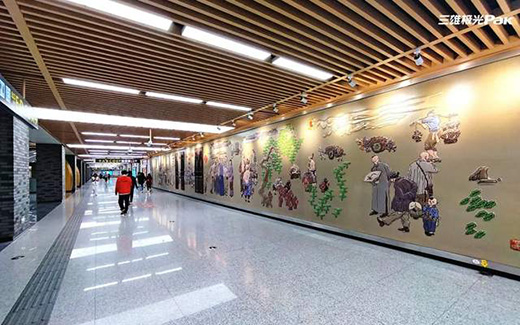 当走进牛王庙站,过道上的灯光氛围使人们清晰地体验到昔日散发浓厚酒文化的市井场景,感受成都老街巷的独特魅力。犹如古人与现代人在行走中进行一场光影对话,由此充分展现成都古典和现代的融合之美。