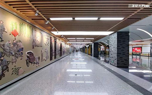 当走进建设北路站,在灯光氛围衬托下,眼前的地铁站满屏都是科技范儿!三雄极光照明设计团队有意通过深色天花背景和线性格栅灯具形成明暗对比,给乘客带来强烈的震撼视觉享受,让本站营造出科技、未来的空间气质。