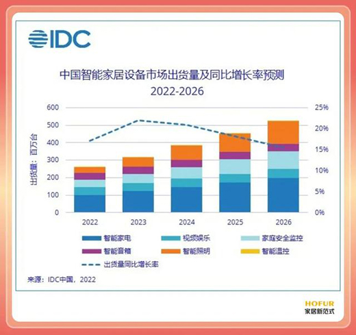 IDC预测,2023年之后,智能照明在智能家居中的规模占比将会逐步提高,预计到了2026年将有接近25%的规模占比。