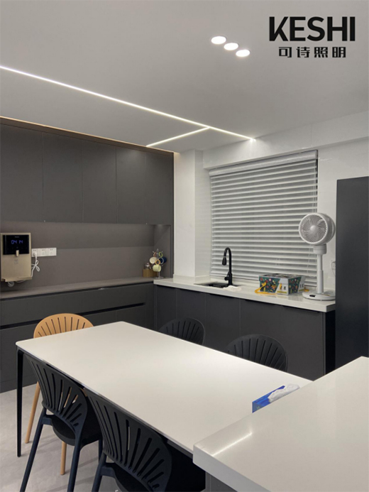 再在吊顶上安装好预埋式线性灯,装饰天花,延伸视线,素静的餐厅马上变得艺术感十足。