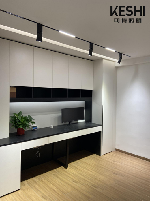 书房采用单排的预埋式磁吸轨道灯,应用上折叠射灯与泛光款磁吸灯,为读书、看电脑、写字等活动提供了充足的光照。又因磁吸轨道灯灵活性较高,可随心移动更换灯具,也给家人在书房的日常活动提供了更高的自由度,围在书桌前一起讨论工作,可以!在远处地板上做瑜伽,可以!在书柜上摆放喜爱的藏品,用灯光打亮,也可以!哪里需要光,就让光往哪里去。