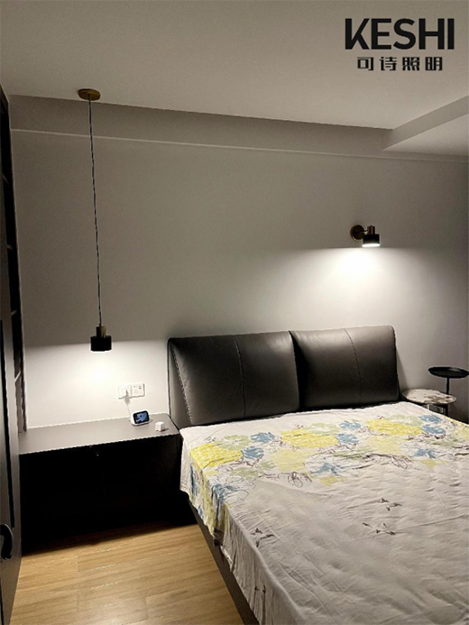 卧室讲究的是温馨感与氛围感。主卧的吊顶围一圈暗藏式灯带,亮灯后既能提供氛围照明,又将吊顶衬托得更为轻盈,赶走压抑感,一举两得。床头两边安排上重点照明,可以应用设计感出色的吊灯或壁灯,为床头看书、刷手机提供充足的光亮,防止因光线太暗而伤眼。