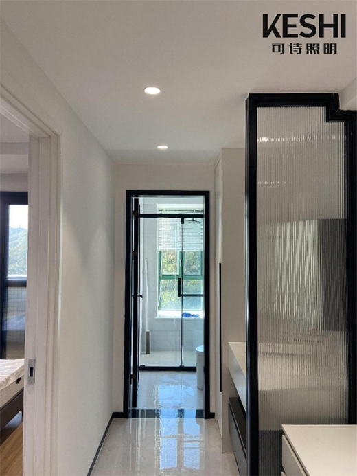 过道处的灯光布局相对比较简单,比如这个连接卫浴间的过道,采用的就是6W的防眩射灯,既能为这空间提供相应的光亮,而灯光照耀到墙上,又显示出漂亮的光弧,瞬间让洁白普通的墙面变得与众不同,这也许就是光作为第四建材的魅力。