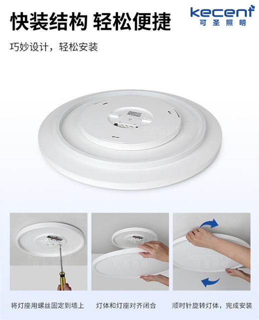 这款灯具拥有快装结构,其安装过程十分简单,首先将灯座用螺丝固定到天花上,然后灯体和灯座对齐闭合,再顺时针旋转灯体,牢牢卡住即可。安装较为轻松便捷,如果大家在安装时还遇到其他疑问,也可以直接联系KECENT可圣照明的客服获取解决方法。