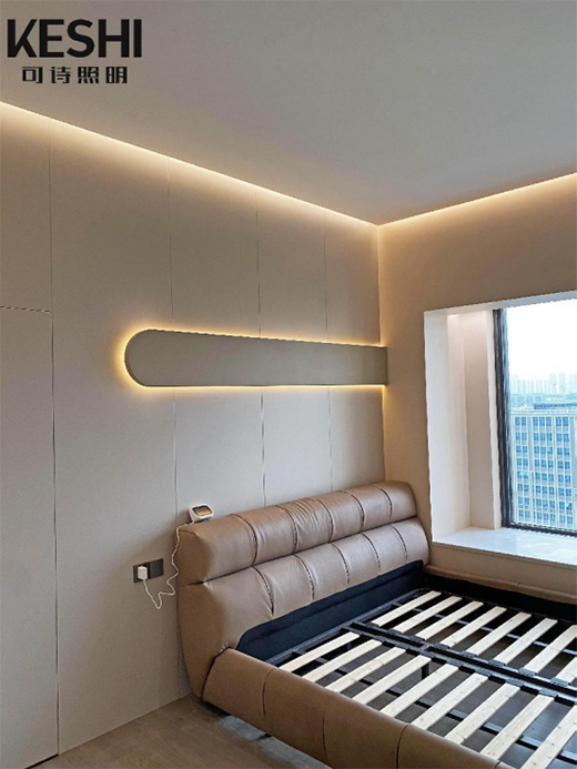 在次卧灯光细节设计上,又各具特色。比如女儿房的床头背景墙应用了柔性灯带,营造成曲线型发光效果,柔美感更强。男儿房的立面墙安装上明装线性灯,打造出视觉上更强的立体效果。客房则采用了设计感更强的长条吊灯,为整体简约空间锦上添花。
