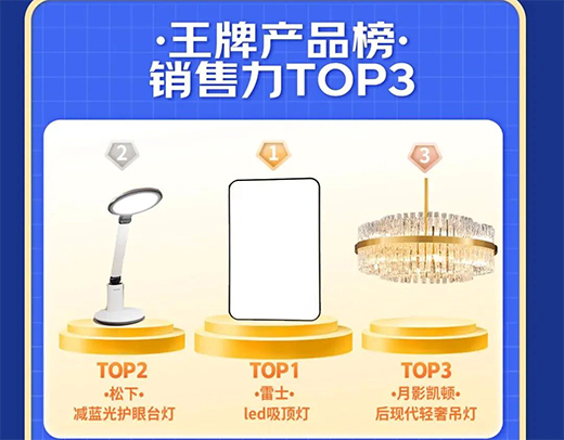“王牌产品榜·销售力TOP 3”分别为:雷士LED吸顶灯、松下减蓝光护眼台灯、月影凯顿后现代轻奢吊灯;