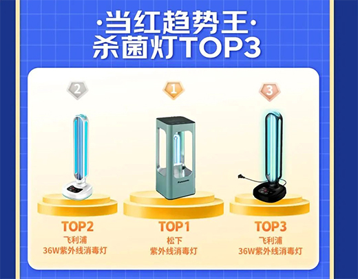 “当红趋势王·杀菌灯TOP 3”分别为:两款飞利浦36W紫外线消毒灯以及松下紫外线消毒灯;