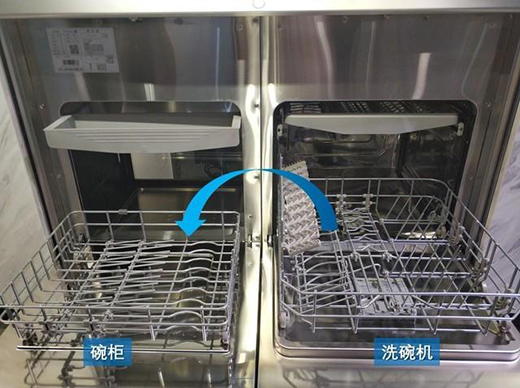 在机器的左下部分则是碗柜模块,和洗碗机模块连在一起。当餐具清洗完毕后,只需微微侧身,就能实现餐具的取放,再也不用在厨房里来回搬运餐具,非常方便。