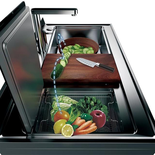 整体的台面采用复式阶梯槽体设计,可以放置沥水帘和切菜板,扩充厨房台面的同时,在清洗完食材后即可进行沥干、切配处理;最右侧还有大空间水槽,能够满足用户的诸多需求。清洗、切配一站式操作,再也不用手忙脚乱。