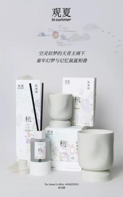 在《观夏·中国甜》系列里,以“东方新摩登”理念作为文化桥梁,观夏邀请到艺术家王濛莎共呈恬淡与热烈共生的水墨画卷。从甜糯市井的姑苏,到轻灵漂浮的杭州,再到热闹喜庆的北平,丰富立体的诗意东方自然流淌而来。基于“东方”的内核,观夏中国甜系列用独具东方风格的传统手工艺承载东方香气。中国甜系列蜡烛,通过蜡杯壁的薄厚变化来呈现透光效果,这种复杂的手工艺只有景德镇的匠人才能驾驭。用特殊的“玉泥”做成这样的蜡烛杯,且不能上釉,只能通过一次次调试颜色,最终达到手感温润,玲珑剔透的效果。