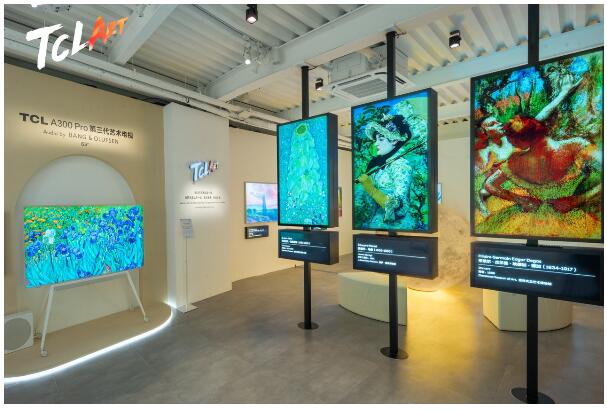 (2F TCLArt世界级艺术画展展区陈览的画作与TCL A300 Pro第三代艺术电视)