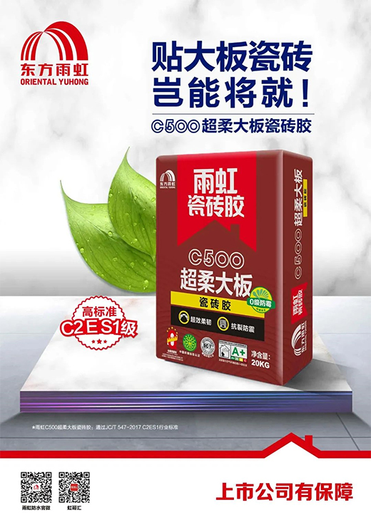 雨虹C500超柔大板瓷砖胶具有超强粘结力度,其拉伸粘结强度可达1.9Mpa(兆帕),极大程度保证了大板瓷砖铺贴的安全性。安全的同时兼具环保,雨虹C500超柔大板瓷砖胶通过了欧洲最严格的的EC1plus环保认证,高度环保,关爱每一刻居家生活。