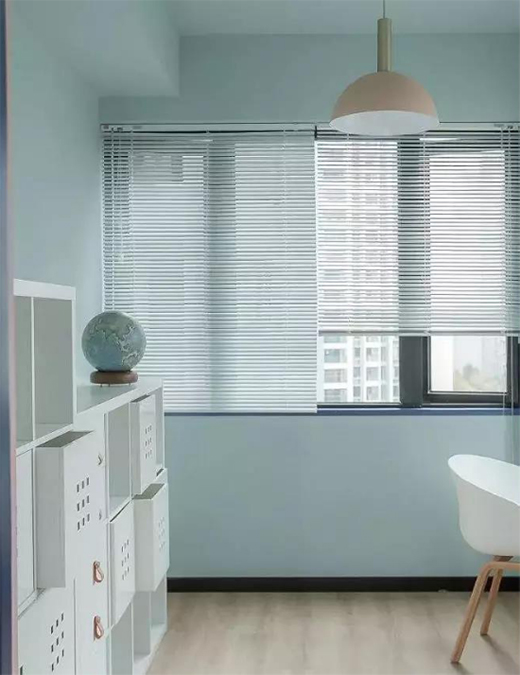玄关用上平涂闪蓝搭配嵌入式白色的换鞋柜和白色拉式窗帘,让人们感觉舒服又耐看。