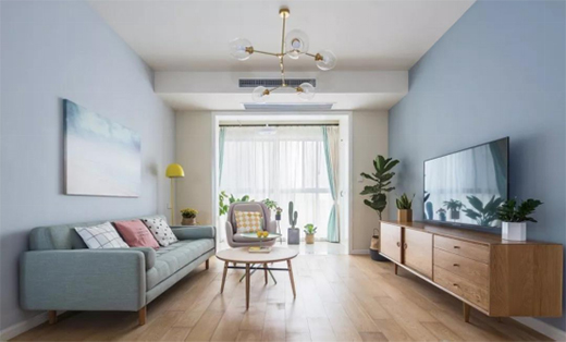 客厅墙面以平涂青出于蓝为主色调,搭配温润质感的木家具,整体布局,线条感强,在视觉上会有拉伸空间的效果,简约自然舒适。