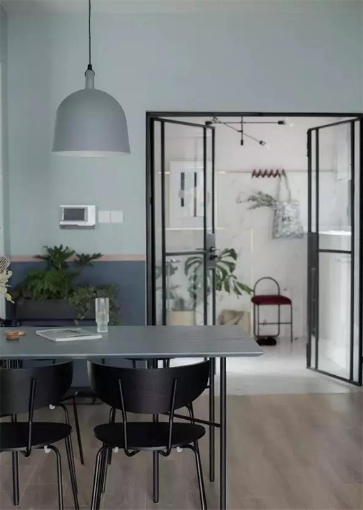 餐厅的墙面上平涂青出于蓝色、闪蓝色,旁边放一些绿色的植物显得和谐又温暖,再搭配简约的吊灯,显得不累赘而又时尚。