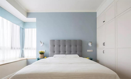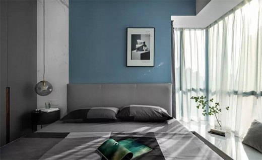 次卧床头背景墙上海蓝加闪蓝调色搭配可以安抚身心疲惫,搭配浅蓝色和中性灰色床品,色彩兼容,整体清新自然。