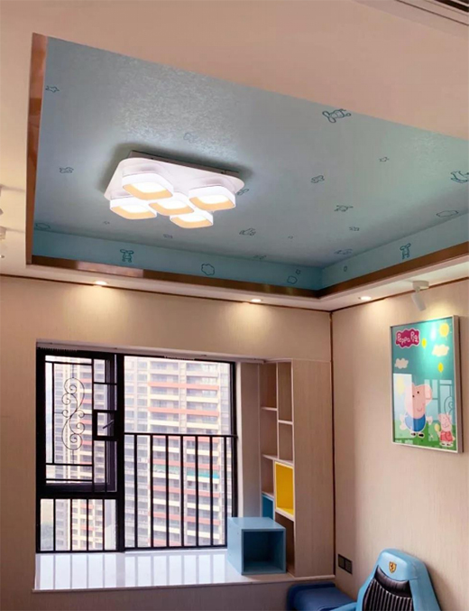 儿童房,用弹涂涧石蓝做天花凹凸感加卡通图案布艺给人可爱温馨的感觉,简洁的布局营造一派热闹的田园美景中弱化了繁杂的感觉,沿海一带湿气重,用上贝壳粉涂料可以达到防霉防潮的效果,减少小朋友因气候多变所引发的感冒、发烧、过敏等问题。