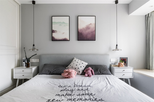 私密空间的处理,尤其彰显简约风格的内涵。卧室背景墙使用纯色贝壳粉涂料,以简约的形式展示,同时也能尽享产品营造出的健康生活空间,让卧室多了几分轻松惬意的氛围。