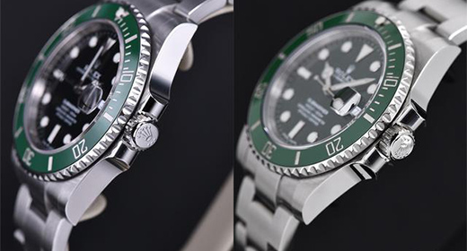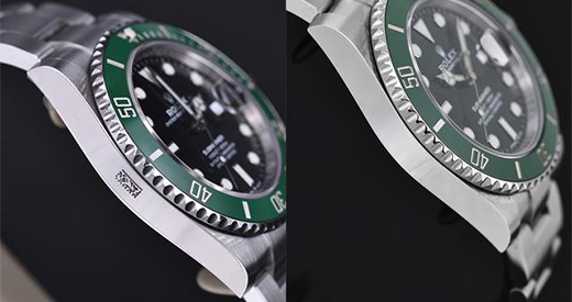 腕表另一侧设有旋入式表冠,顶部镌刻有劳力士标志皇冠标识,下方的三个点则代表为表冠具备三扣锁三重防水系统,表冠设有防滑坑纹设计以便佩戴者方便调节。表冠牢固旋紧于表壳使得腕表防水性能可深达300米。表壳这一侧的改动在于表冠护肩,劳力士将新款的护肩调整至更加窄细了一些,这点我们可以从对比图上看出来,但也确实不是很明显。