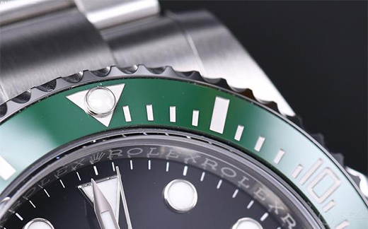 看完了表壳的变化,我们再来看看外圈。新款绿水鬼的绿色单向旋转60分钟刻度外圈依旧使用陶瓷制作而成,陶瓷材质十分的防刮损且不因环境而受影响。外圈上的模铸刻度与数字均以PVD镀膜技术镀上铂金,12点方向上设有一个“夜明珠”。外圈的坑纹设计利于潜水员即便佩戴手套也可轻易抓握调节设定潜水时间。