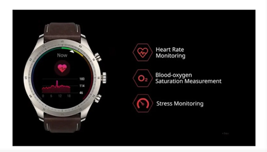 该表配备了许多传感器,包括用于血氧饱和度检测的SpO2传感器, 24小时心率监测器, 地磁传感器,陀螺仪 晴雨表, 加速度计和一个环境光传感器。