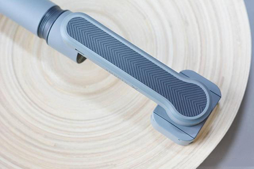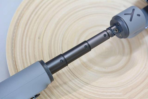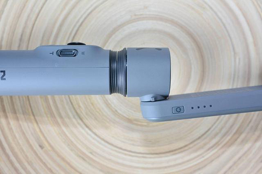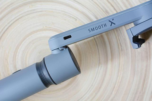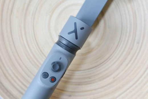Smooth-X的手柄是最核心的操控部分,正面设计很简洁,中间有圆盘是控制轴向,左右控制航向轴,上下控制横滚轴;M按钮是模式切换,双击可实现手机横拍或竖拍;红点按钮就是拍摄/录制;以及右侧还有一个变焦拨钮。另外,和自拍杆一样是可以伸缩的,这会增加延长至260mm。每一节连接处都有固定螺丝,做工比较扎实。