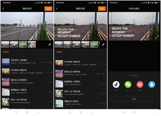 按下这个按键后,连续拍摄四段视频,然后将云台相机插入手机后,可以快速智能的生成剪辑好的Vlog短视频。