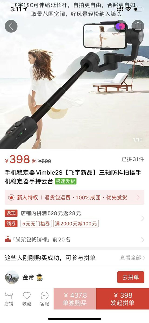 但是由于这款稳定器确实种草,自拍杆+稳定器的结合,这不就是我梦想中的稳定器吗?秉着不死心的心态,笔者决定货比三家,打开的平台越多心越凉,一水的599元让给我一种我的钱包正在想我挥手告别的感觉。直到笔者打开拼多多,看到飞宇Vimble 2S售价仅398元了,突然感觉钱包有救了——啥也不说了直接买它!