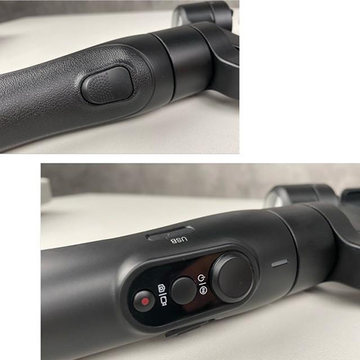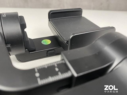 在手柄侧边有着Micro-B的电源接口,另一边是推动变焦控制开关,蓝牙连接手机后,可以通过这个变焦开关控制手机镜头的焦距。