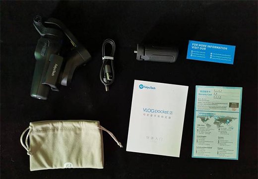 麻雀虽小,可五脏俱全,飞宇vlog pocket 2可折叠手机稳定器包装盒中除了说明书、保修卡外,还有三角支架和数据线,更贴心的是赠送了个保护袋,折叠携带的时候也不用担心刮伤主机了。