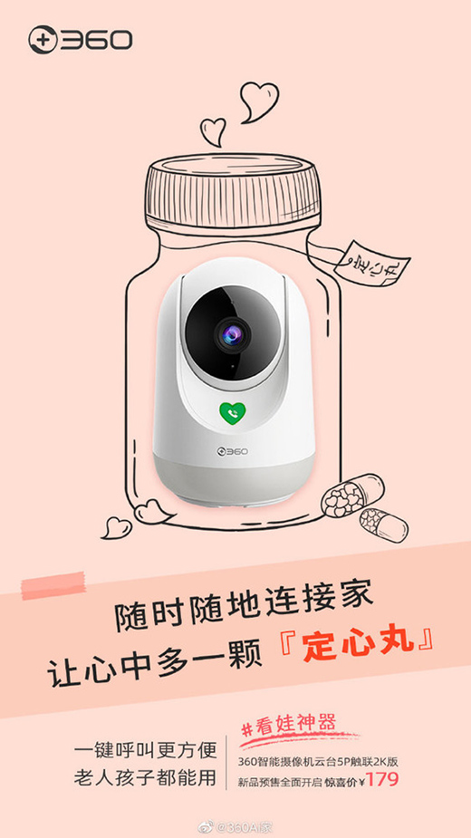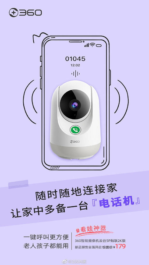 9月7日,360智能摄像机云台5P触联2K版正式开启预约,9月9日正式发售,到手价179元。