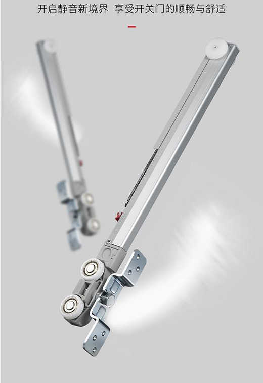 该款推拉门五金的全部五金件采用消音降噪设计,营造舒适安静的生活空间。新的专利滚轮设计,滑轮支撑件内置减震硅胶,滑轮组件运行更平稳更静音。这种特性甚至可以抵消一些滚轮装置因墙面缺陷、轨道安装状态而带来的不平等因素。集成的阻尼及自闭系统,结构紧凑,可以从轨道下口取出,便于安装和维护。