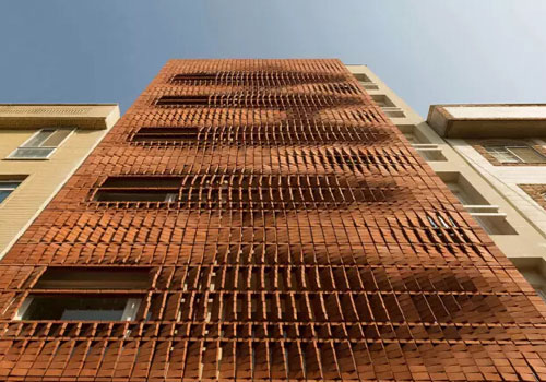 Hisanori Ban的不同寻常的外观设计同时也代表着近几个月来许多公司对于材料应用的更广泛的研究。这些新尝试中最引人注目的一个项目就是Admun Design and Construction Studio事务所的“隐于砖”项目,它位于伊朗的德黑兰。建筑师抛开了这种古老材料的常规属性和传统砌筑形式,创造出了一种高低起伏的形式,相对于黏土块来说更像织物。