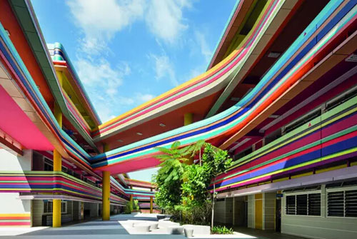 这种红土的暖色系外观已经足够引人注目了,但是如果你需要进一步的证据来表明建筑师正在彻底打破老套的“去色化”设计,这里倒有一个足够多彩的建筑设计可供参考。也许最有活力的建筑当属Nanyang小学,这是Studio505的一个设计项目,它那如糖果般多彩的立面“展现了充满活力的,无拘无束的自由思想,为孩子和老师们带来喜悦和兴奋。”这是一座连整天沉着脸的密斯凡德罗见了都会微笑的建筑。
