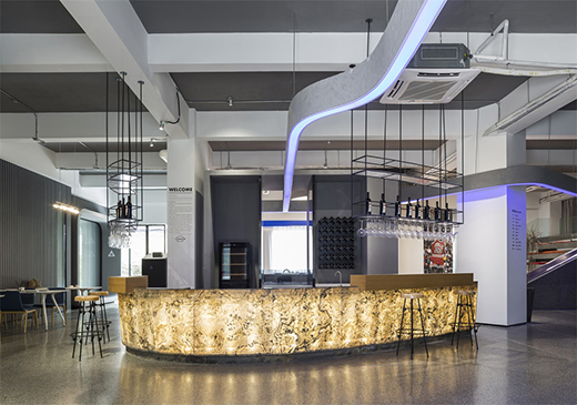 前台接待区与吧台设计融为一体,为了在建筑材料和设计细节上别出心裁,吧台由天然岩片拼接而成,配以暖色灯光,彰显公司文化的同时呈现家的温暖与朝气,使得整个环境给来往的访客和员工眼前豁然开朗的视觉感受。
