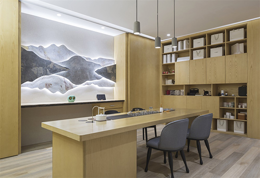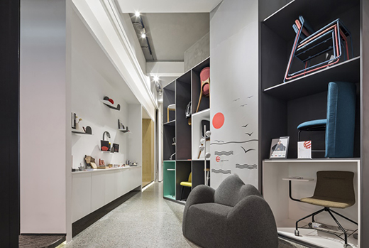 设计师将文创展示区和产品展示区结合,让展示区域不再单调,形成一个小型的家居店。产品展示区主要以灰色格子作为视觉展现,在强化空间界限的同时,运用绿色格子和白色格子营造出具有创意性的视觉体验,此外添上色彩斑斓的椅子,构成空间色彩妙用的对比关系。而对立面的文创产品区通过连绵起伏的山挂件展示极具创意的文创产品,同时表达企业追求不断创新的精神。