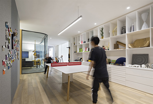 设计师对材料区进行了大胆的构思,将原本空旷的中间区域改造成乒乓球区,不但解决了空间容纳度,同时营造出区域丰富的架构,让工作和玩同时得以实现。